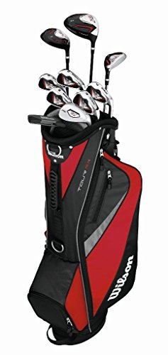Your confidence level will soar as your score plummets thanks to this Wilson tour rx men's complete golf set! the titanium composite driver produces a straighter flight even on off-center hits, the hybrid features a larger head for added forgiveness and the fairway wood has a low center of gravity to launch the ball with greater accuracy. Also included are perimeter-weighted irons, a pitching wedge, a blade putter and a carry bag.